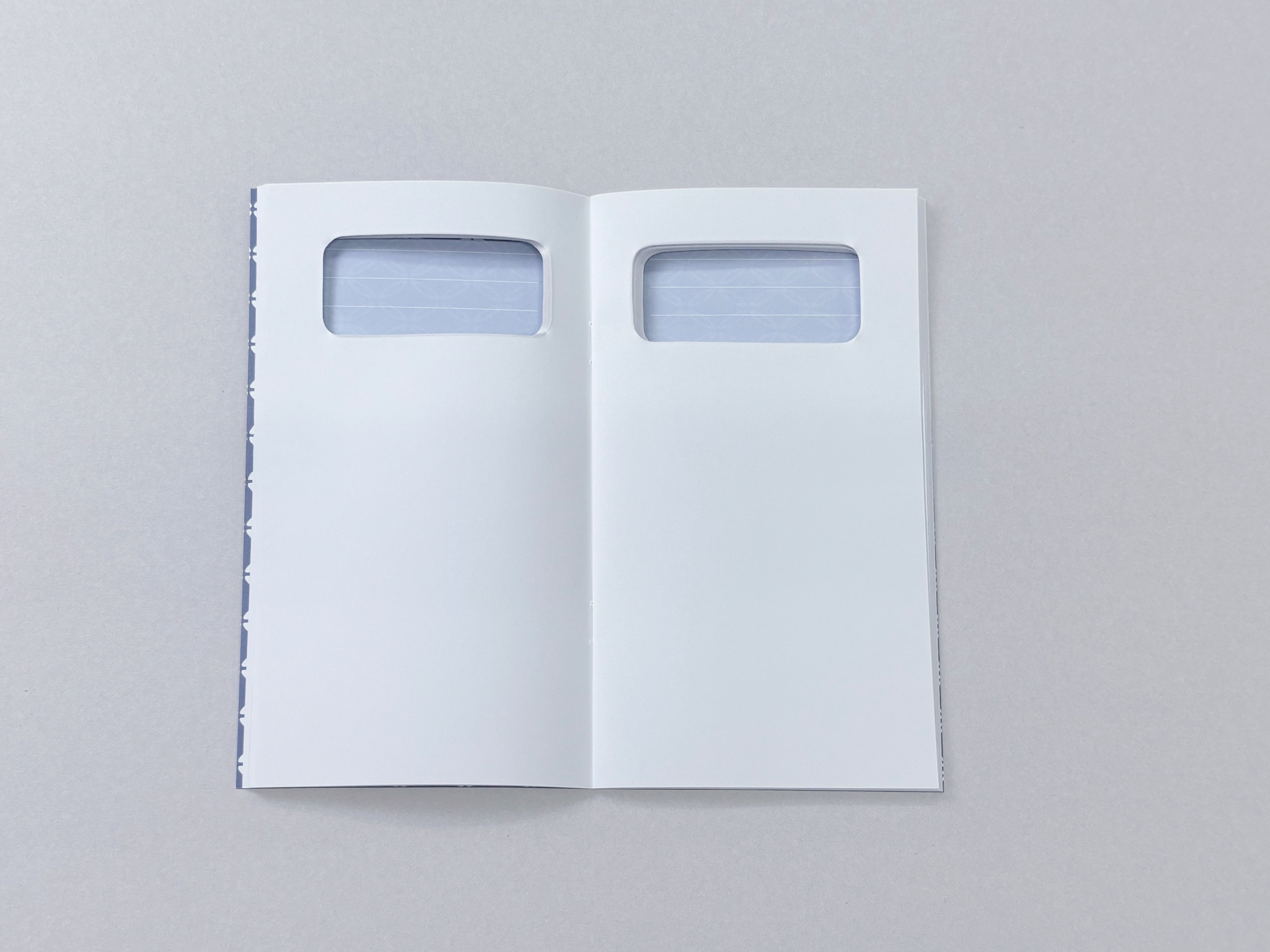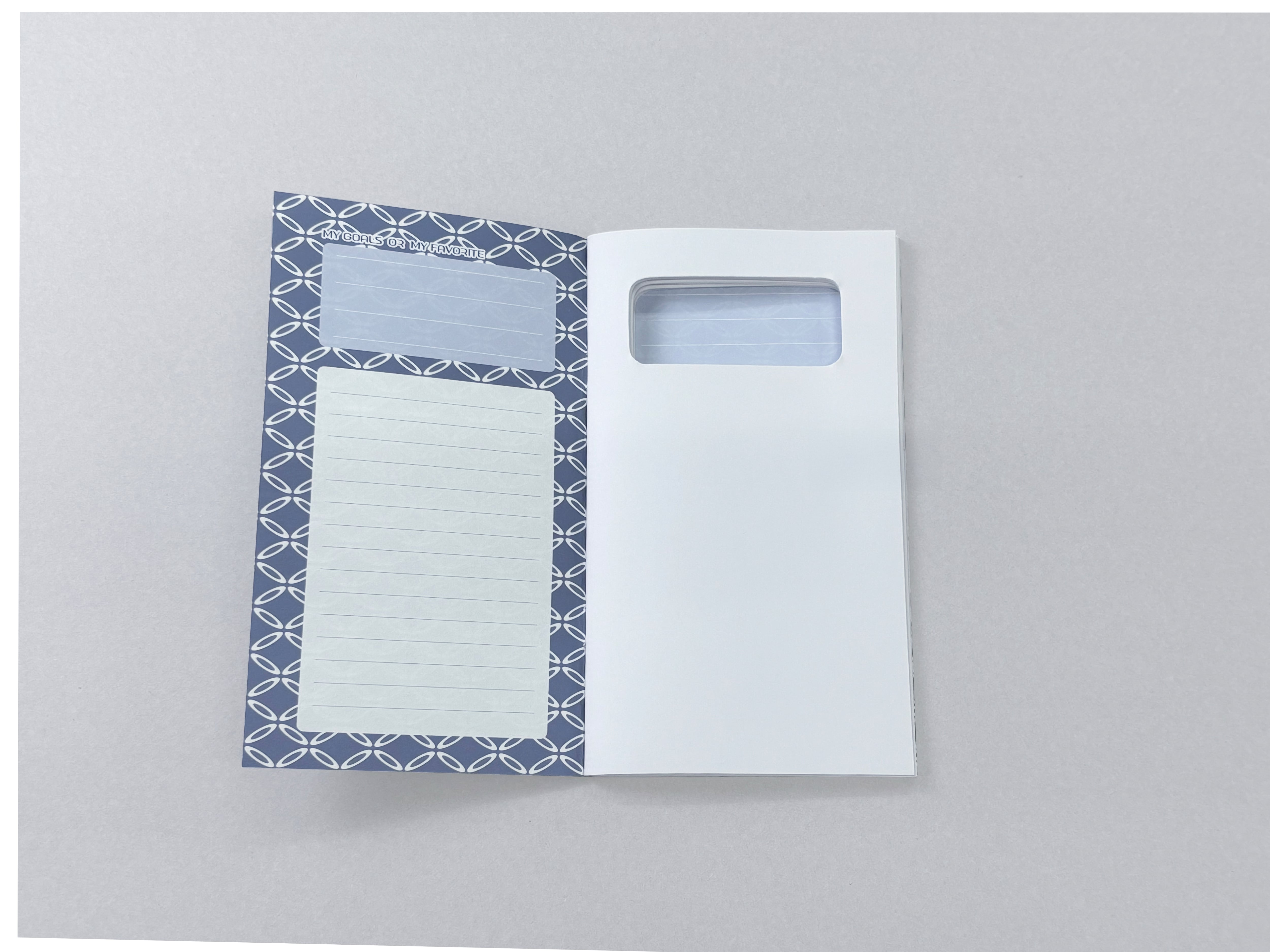 最大の特徴の窓穴デザインにより、推しの写真などが使用している間どのページからも目に入ります。日本伝統の七宝模様を表紙と裏面にデザインしました。本文は自由な発想で使ってもらうため無地にしています。