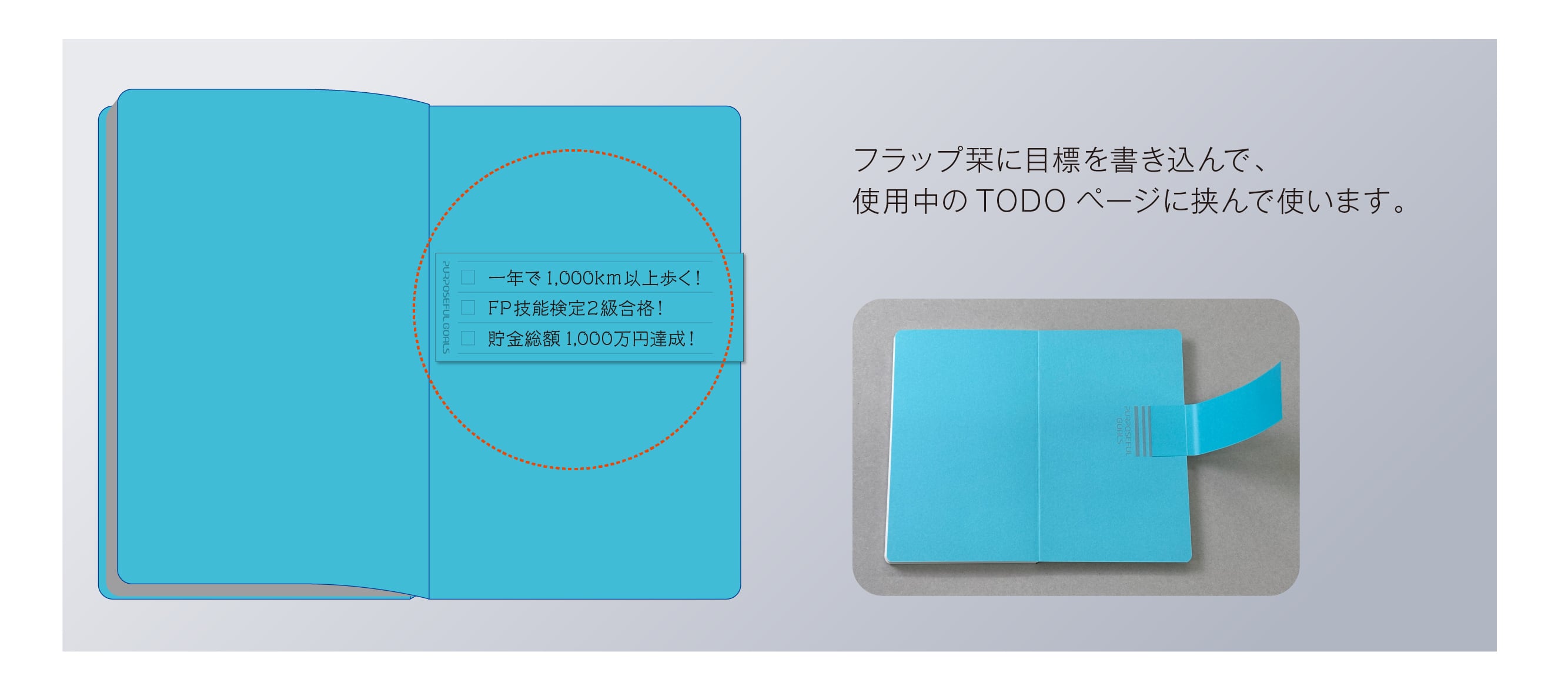 使用しているページに目標が書けるフラップ栞を挟めるので、パッと開(ひら)けてゴールが見える、チャレンジする人を応援する目標達成ToDoノート&フリーダイアリー「BLUEPRINT BOOKMARK」(ブループリント・ブックマーク)。自分で書いた目標がノートを開いた時に必ず見えるので、モチベーションを高く保って、夢や目標の達成を強力にサポートし、実現へと導きます。MADE IN JAPAN。